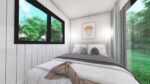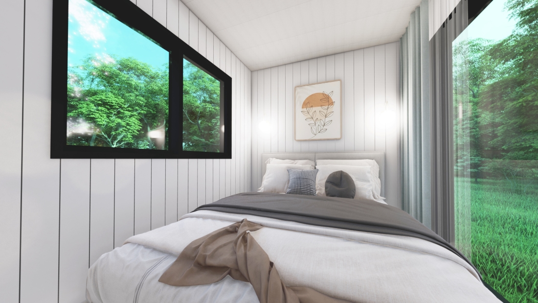 The VC121-40HQ05 is a thoughtfully designed 1-bedroom container home built from a single 40ft High Cube shipping container. Featuring a central entry that welcomes you into a bright living and dining area, a fully equipped kitchen nearby, a private bathroom at one end, and a peaceful bedroom at the opposite end, this efficient layout creates a spacious, comfortable home perfect for individuals, couples, or luxury glamping accommodations.